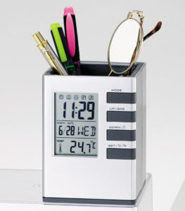 洗練されたモノトーンデザインの時計付ペンスタンドです。フォトフレームも付いていてデスク周りを素敵に飾ります。